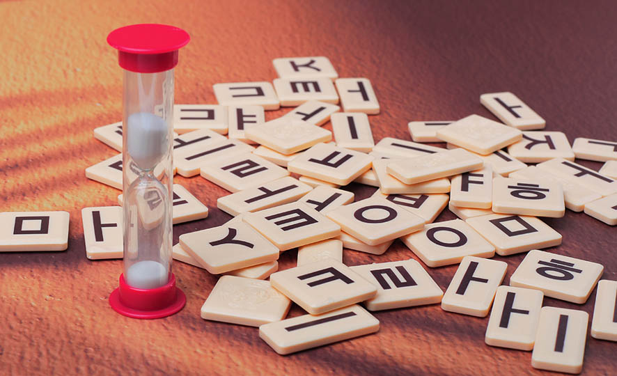 준비: 무작위로 뽑은 자음 타일 14개와 모음 타일 10개를 바닥에 공개적으로 늘어놓습니다.