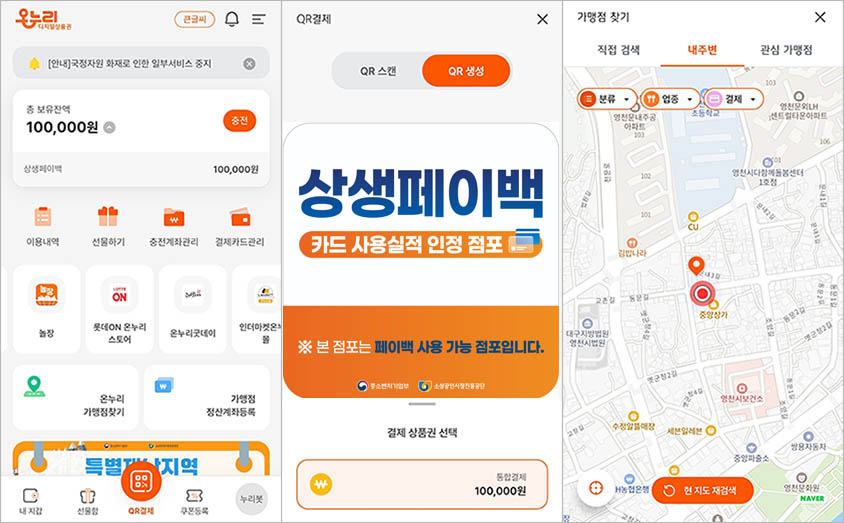 상품권 운영 기관에서 제공하는 앱에서 ‘온누리 가맹점 찾기’ 에서 직접 검색 또는 내주변 메뉴를 이용해서 가맹정를 찾을 수 있습니다. 내주변 메뉴의 경우 현재 내가 위치한 곳의 주변에 있는 가맹점을 지도위에 표시해줍니다.