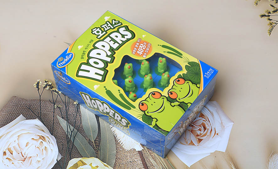 호퍼스는 주어진 문제 상황을 해결하는 1인용 퍼즐 게임으로, 문제 카드의 그림대로 개구리들을 배치한 후 다음의 딱 하나의 규칙에 따라 개구리들을 움직여야 합니다. 개구리는 반드시 다른 개구리를 뛰어넘으면서 이동만 가능합니다.