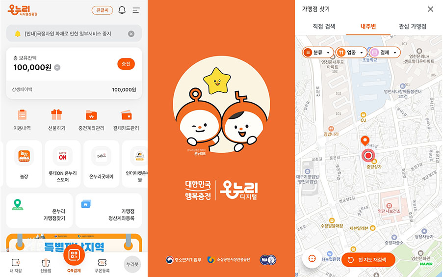 - 온누리상품권: 국비 사업으로, 전국 전통시장 가맹점 어디서나 사용 가능합니다. (서울 사람이 부산 자갈치 시장에서 쓸 수 있음)