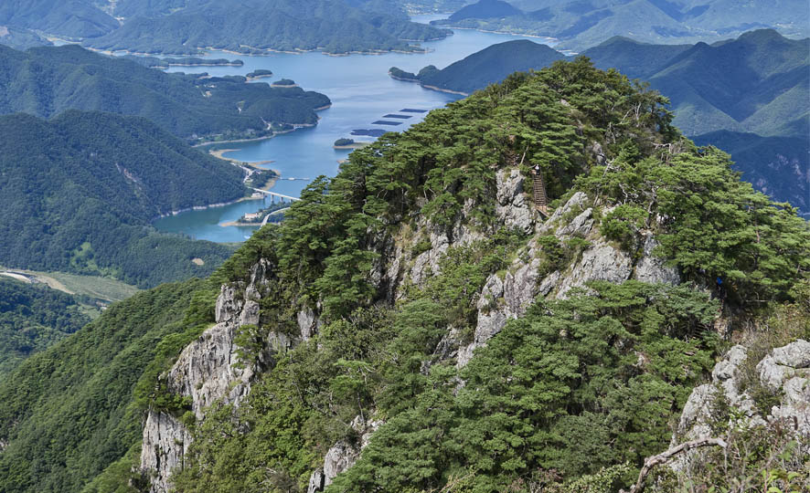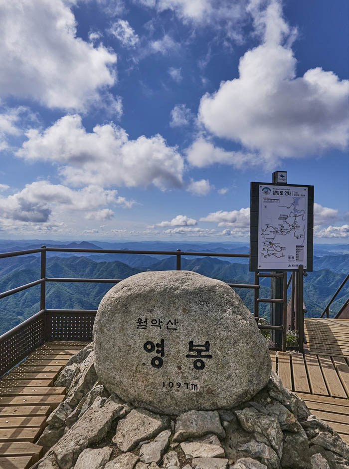 하봉을 지나 중봉으로 향하는 길은 더욱 험난하다. 거대한 바위들 사이로 위태롭게 놓인 계단과 가파른 경사가 기다린다. 하지만 힘든 만큼 보람도 편! 중봉 전망대에 서니 마치 뭉게구름이 내려와 반겨주는 듯합니다. 3개의 거대한 암봉이 나란히 놓여있고, 앞으로는 영봉을 오르는 Z자형 계단이, 뒤로는 충주호의 물줄기가 한눈에 들어옵니다.