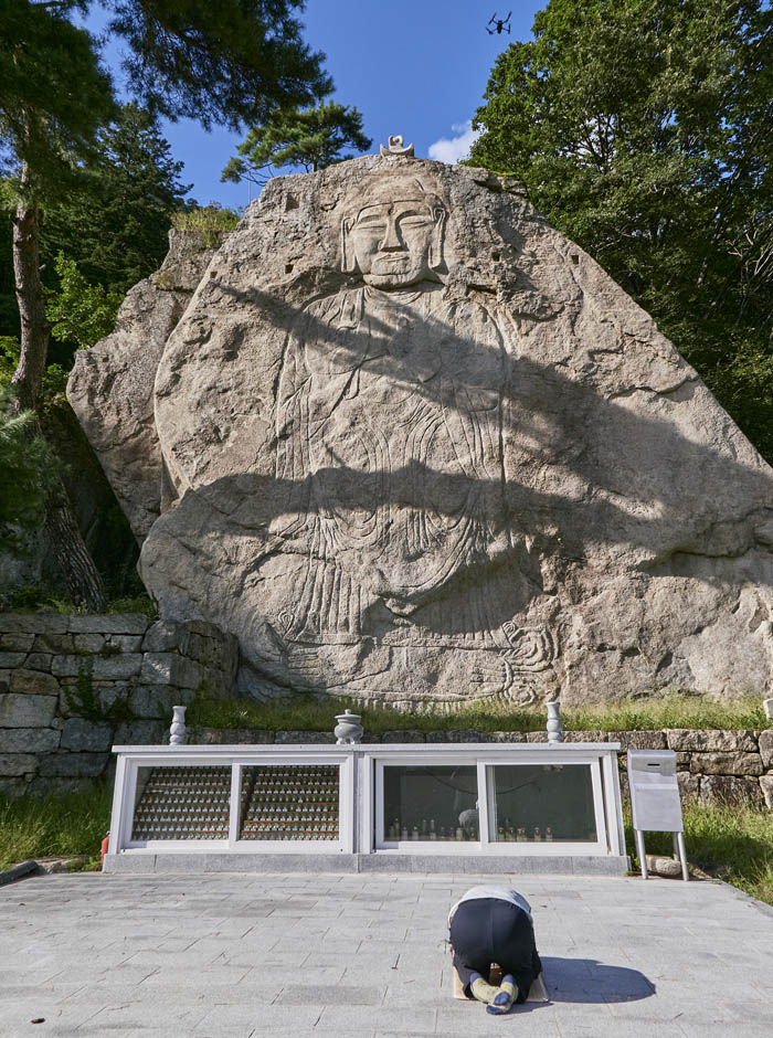 하산길은 마애불이 있는 덕주사로 내려갑니다. 덕주사까지의 5km 구간 중 2km 정도는 가파른 계단길입니다. 내려오는 길에도 곳곳에 숨어있는 멋진 풍경들을 놓치지 않고 눈에 담았습니다. 높이 13m의 거대한 마애불은 얼굴 부분은 약간 양각으로 조각되었으나, 아래로 갈수록 선으로만 묘사되어 있어 특이한 형태의 조각상이라 할 수 있습니다. 숲길을 지나 덕주사 주차장에 도착하니 햇볕이 따갑습니다. 월악산은 자연의 아름다움과 역사의 숨결을 동시에 느낄 수 있으며, 충주호의 비경과 기암괴석들이 어우러진 정상 부근의 풍경은 잊을 수 없는 파노라마입니다.