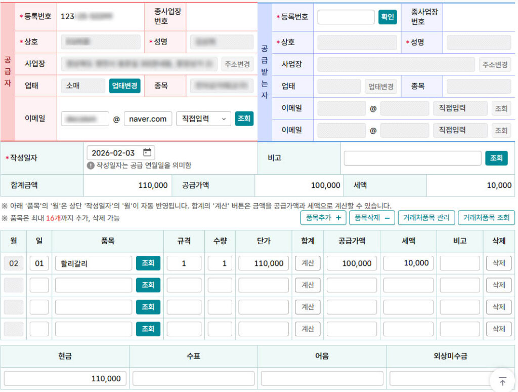 예를 들어 110,000원짜리 상품을 거래했다면 단가는 110,000원, 공급가액은 100,000원, 세액은 10,000원이 자동 입력됩니다.