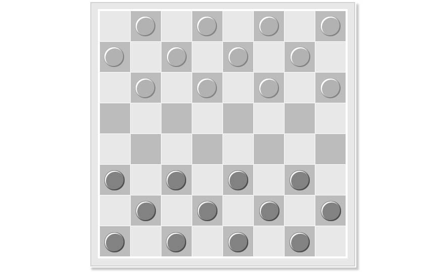 기물 배치 : 각 플레이어는 12개의 말을 가지며, 판의 검은색(어두운색) 칸에만 배치하고 움직입니다.