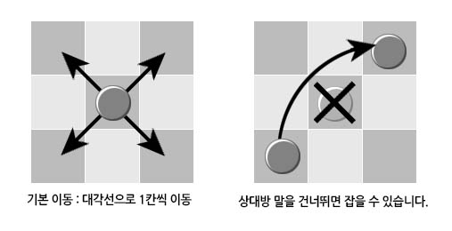 따먹기 (점프): 상대방의 말이 인접한 대각선 칸에 있고, 그 말의 바로 뒷 칸이 비어 있을 때 (검은색 칸 기준), 자신의 말을 상대방 말을 뛰어넘겨 그 말을 따먹습니다.