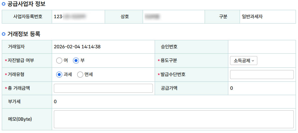 1). 현금영수증 발행 정보 등록
