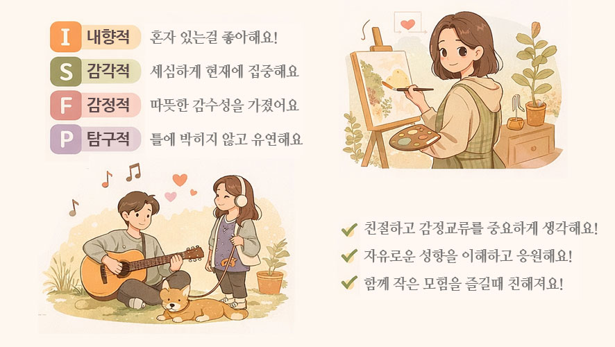 이들은 ISFP의 감성을 존중해주고, 부드러운 관계를 유지하는 데 도움을 줍니다.
